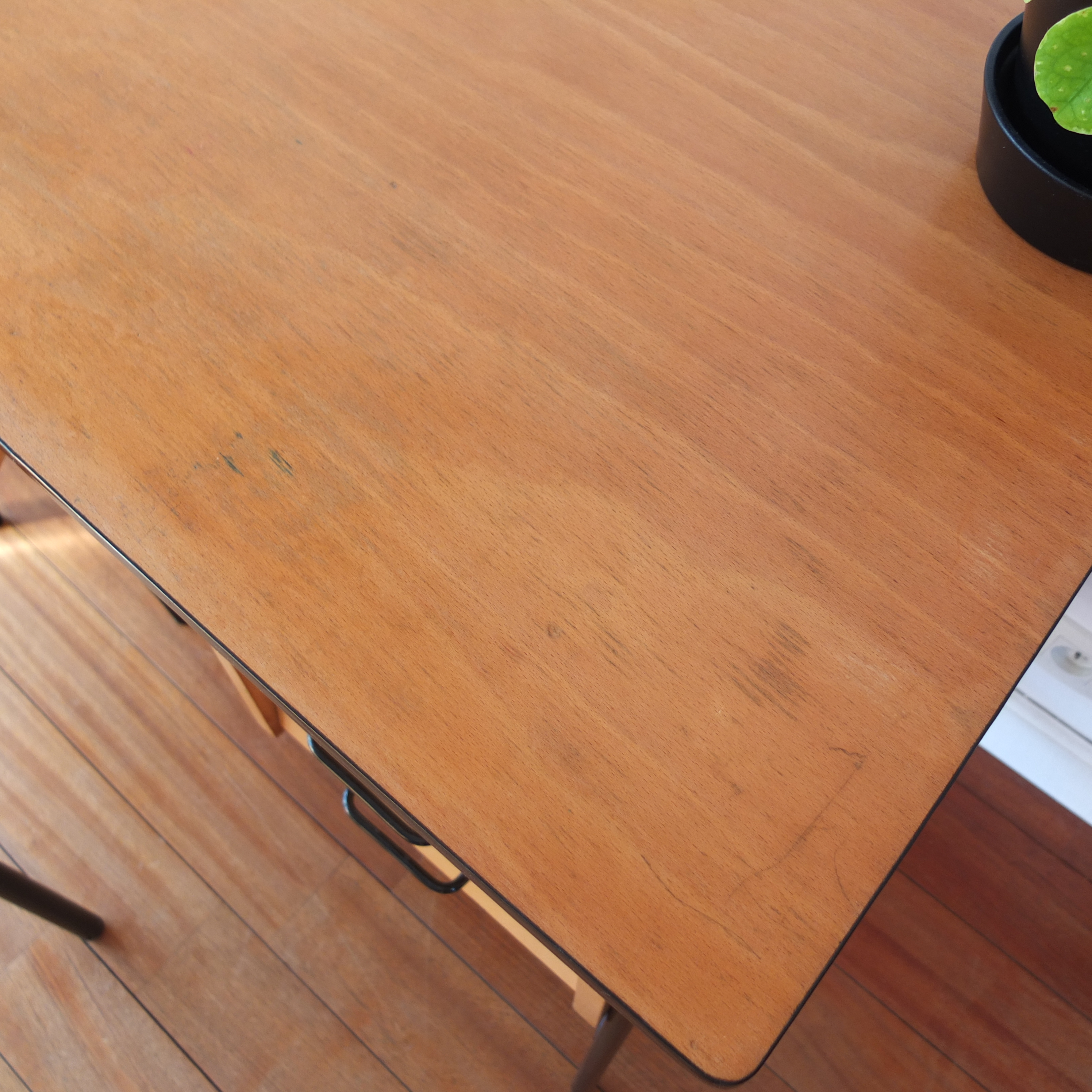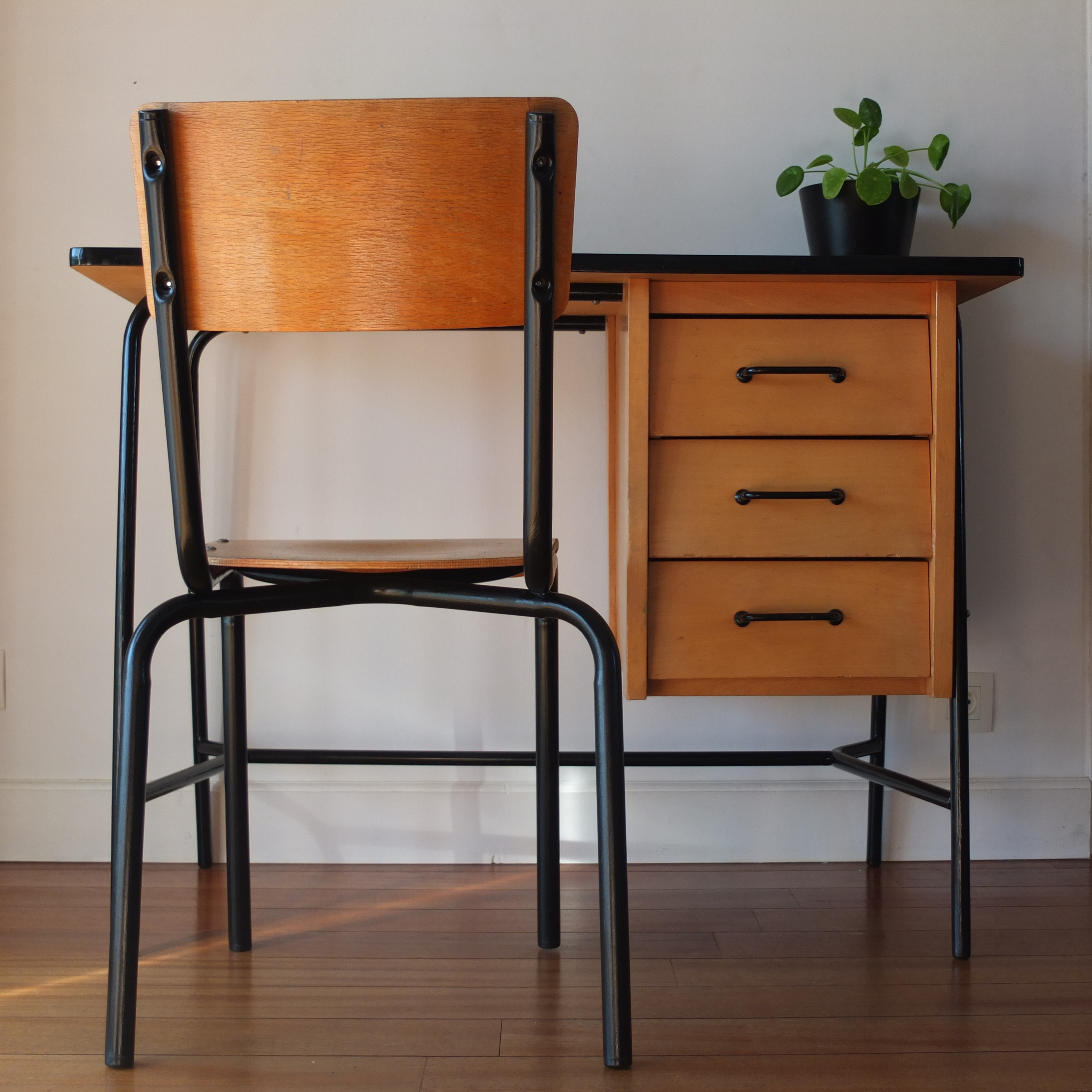 Typique des annees 50 avec son bloc trois tiroirs, les montants en métal ont été repeints tandis que le bois est laissé dans son jus. Quelques traces du temps renforce l'authenticité du bureau.