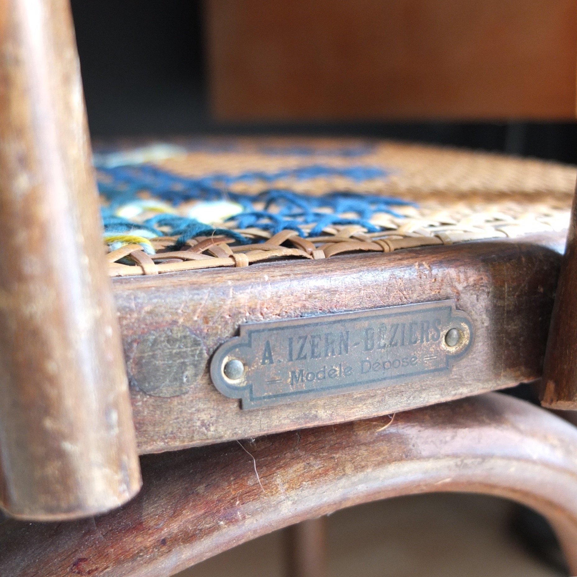 Cette chaise de bistrot ancienne ressemble à une Thonet , fin XIXeme donc mais elle est estampillée A.Izere Béziers, modèle déposé, le mystère reste entier. Cela renforce son charme!